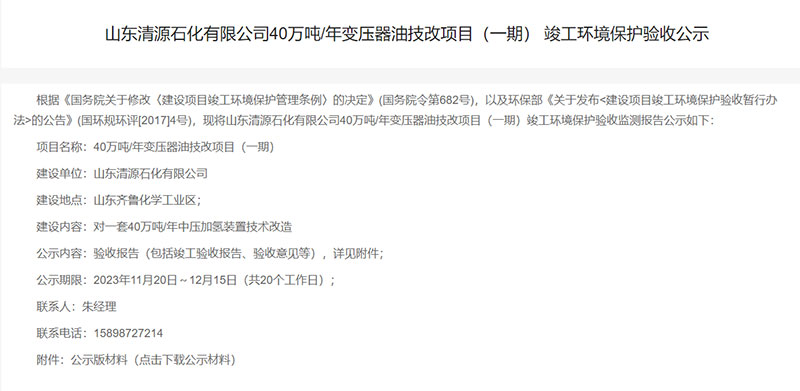 山東清源石化有限公司40萬噸/年變壓器油技改項(xiàng)目(一期) 竣工環(huán)境保護(hù)驗(yàn)收公示